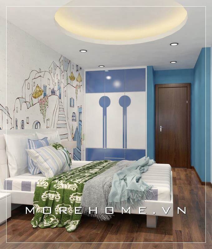 Bố trí nội thất phòng ngủ chung cư hiện đại tại phòng ngủ của con hợp lí, tủ quần áo âm tường kịch trần tạo cho không gian thêm cao hơn