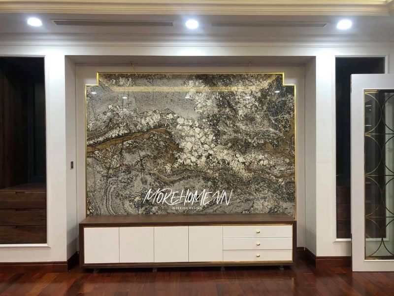 Morehome thi công đá ốp vách tivi bằng đá granite cao cấp với hoa văn tự nhiên sang trọng cho công trình HN