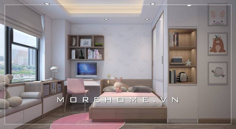 Mẫu bàn học được thiết kế theo kiểu dáng hiện đại và năng động, có thể liên kết với giường ngủ bằng gỗ công nghiệp.